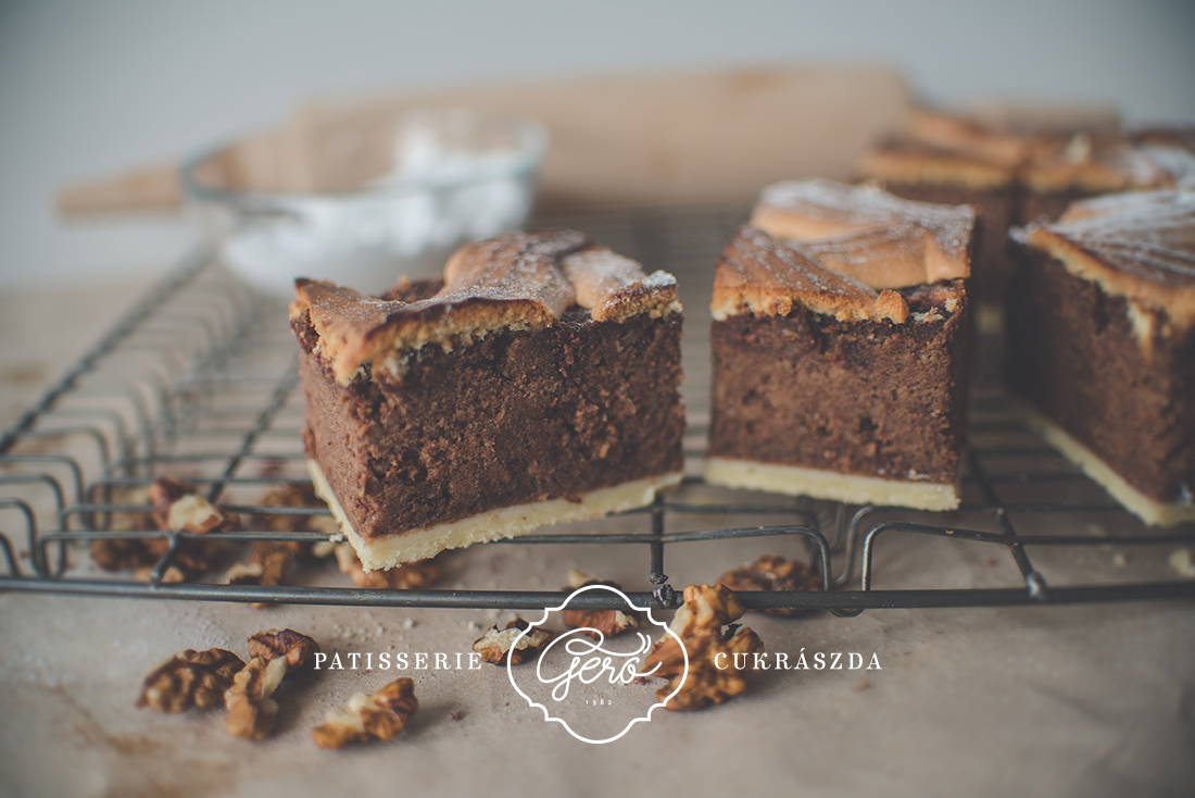 Linzer lapok között szaftos, mazsolás diós töltelék.