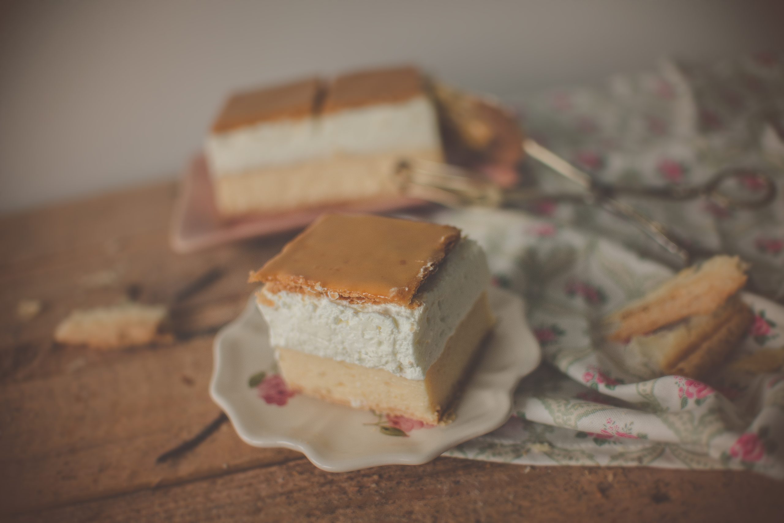Vajjal készült krémes lapon lágy, vaníliás sárgakrém, rajta állati tejszínt felhasználásával készült habos réteg, tetejét karamellás fondánnal bevont krémes lappal zárjuk.