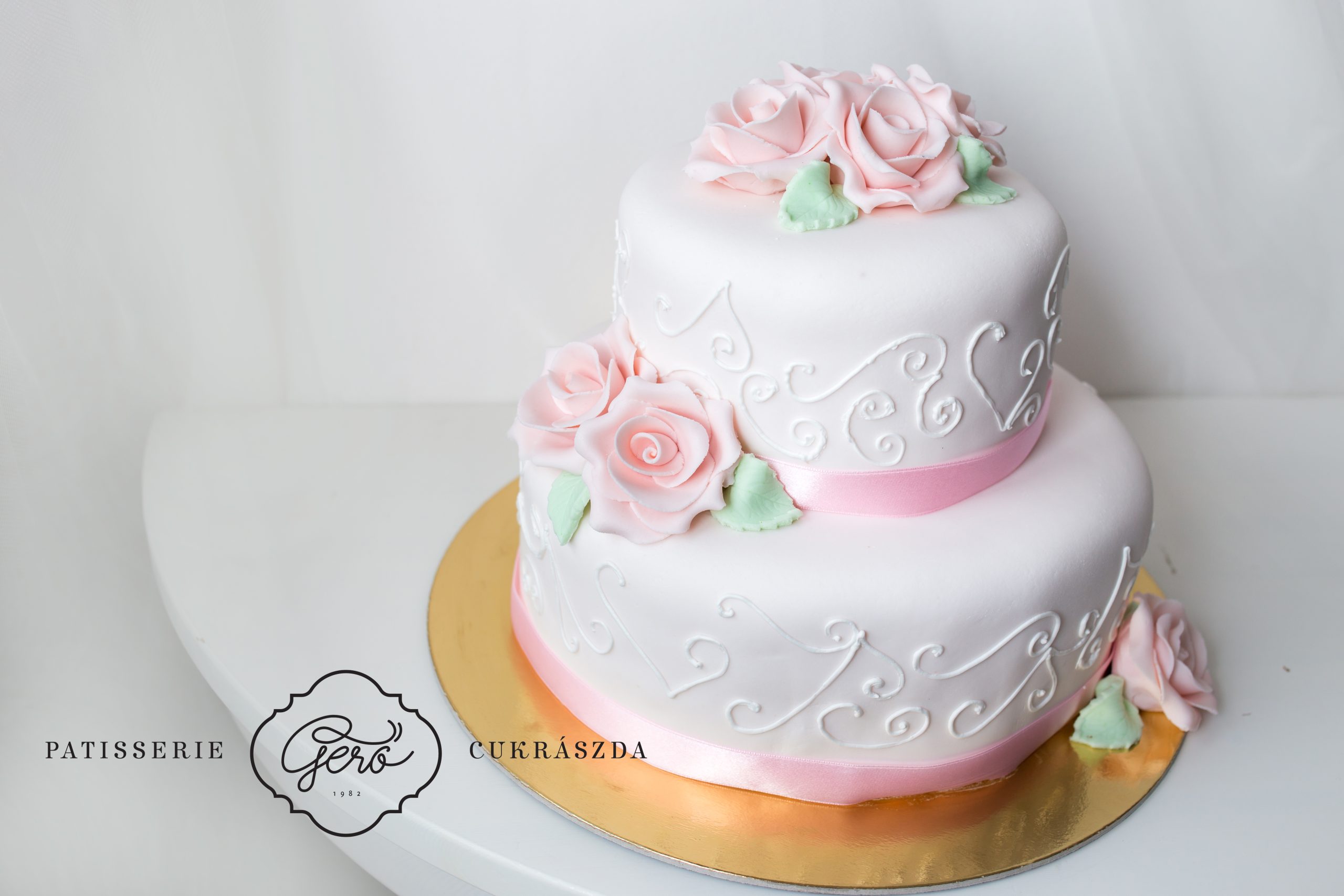Két emeletes (alsó szint: 32 szelet, felső szint: 12 szelet), marcipánnal burkolt keresztelői torta. Főzött krémmel készítjük, az ízesítését a megrendelőlapon szükséges kiválasztani.