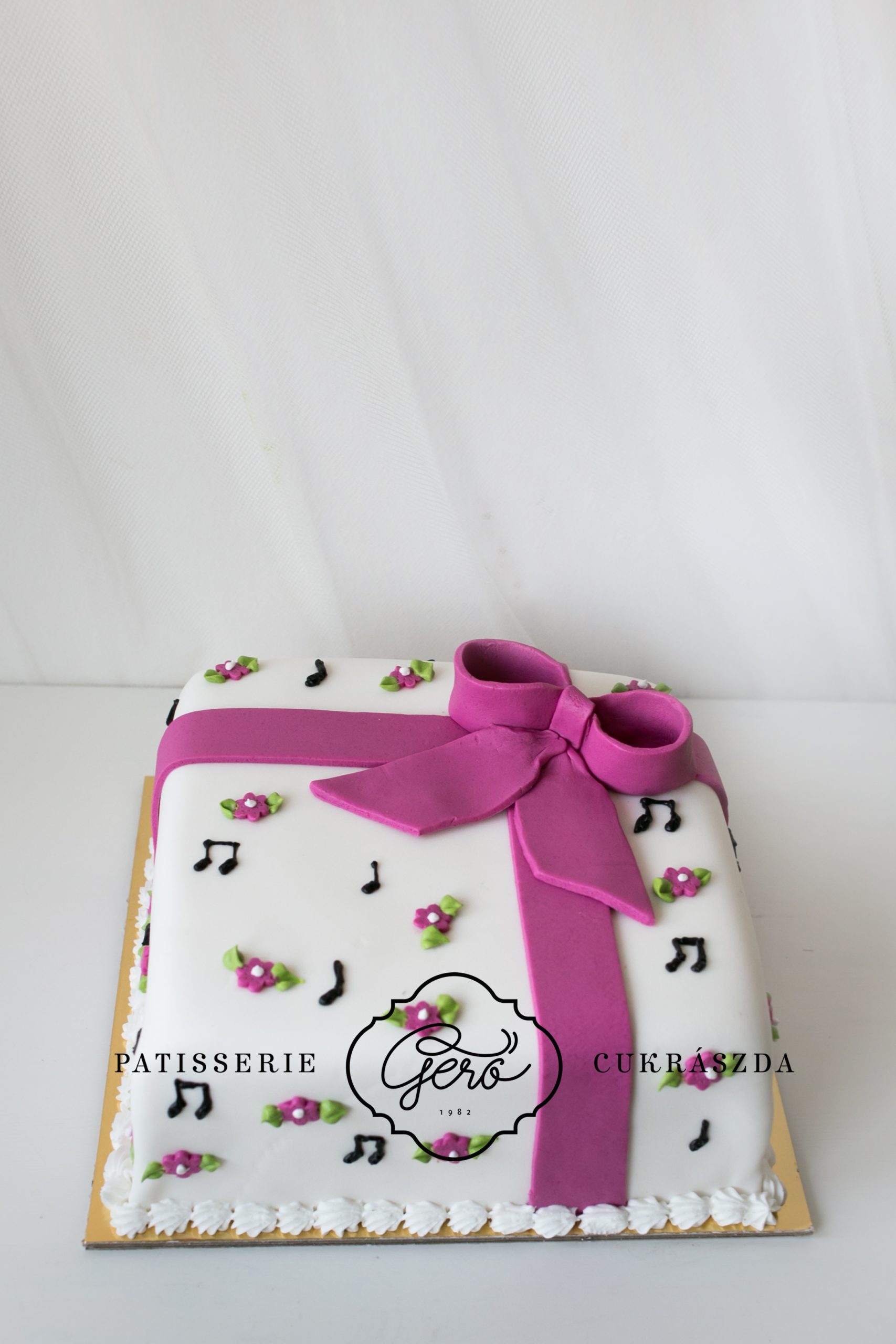 Normál (16 szeletes), négyzet alakú, marcipánnal burkolt és marcipánnal díszített alkalmi torta. Belül főzött krémmel töltjük, ízesítését a megrendelőlapon szükséges kiválasztani.