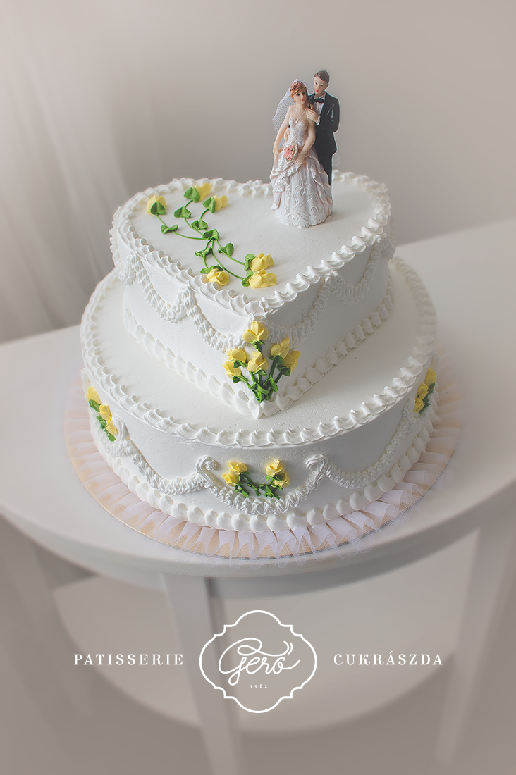 Kétemeletes (alsó szint 32 szeletes, felső szint 12 szeletes) krémmel díszített esküvői torta. Belül főzött krémmel készítjük, ízesítését a megrendelőlapon szükséges kiválasztani.