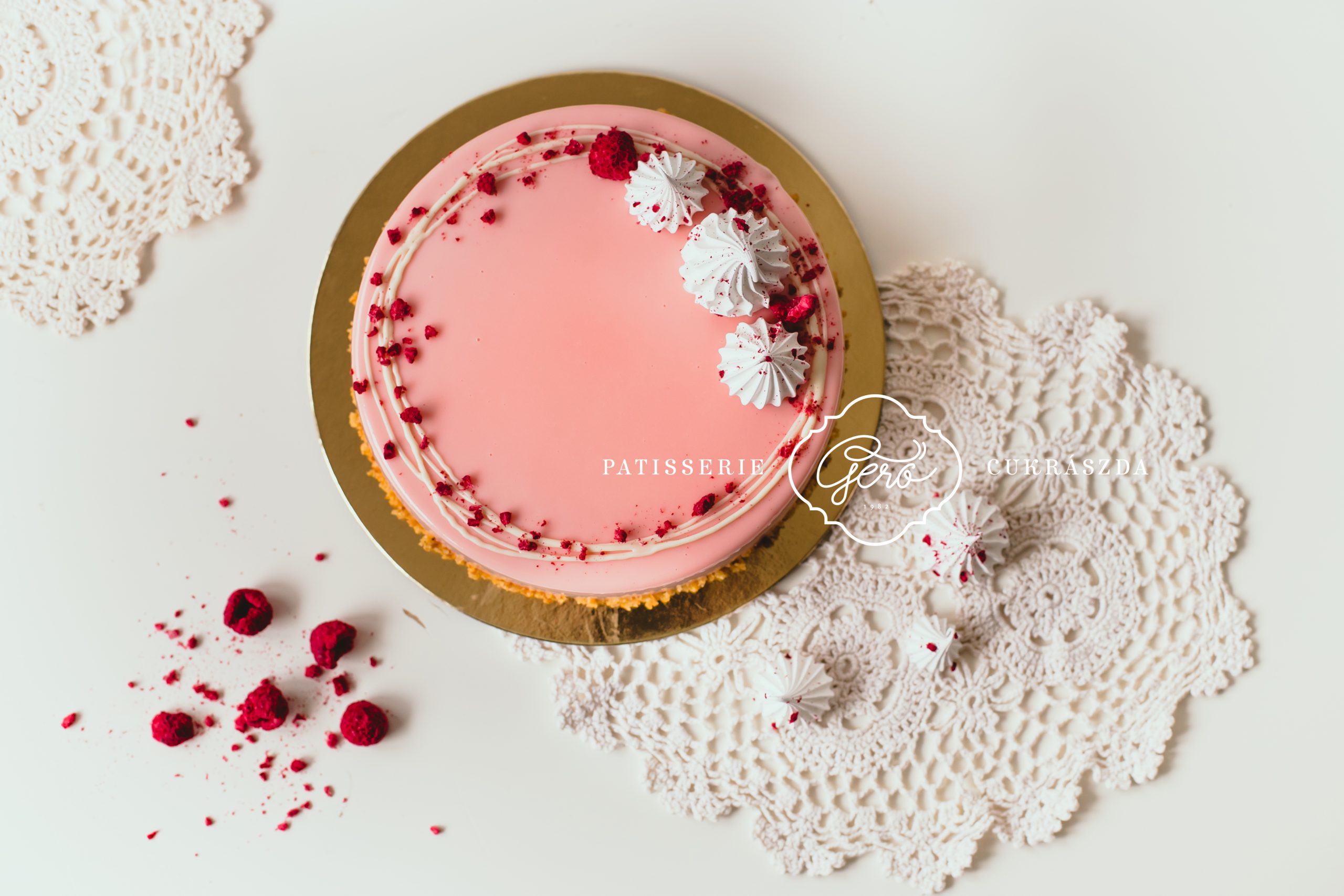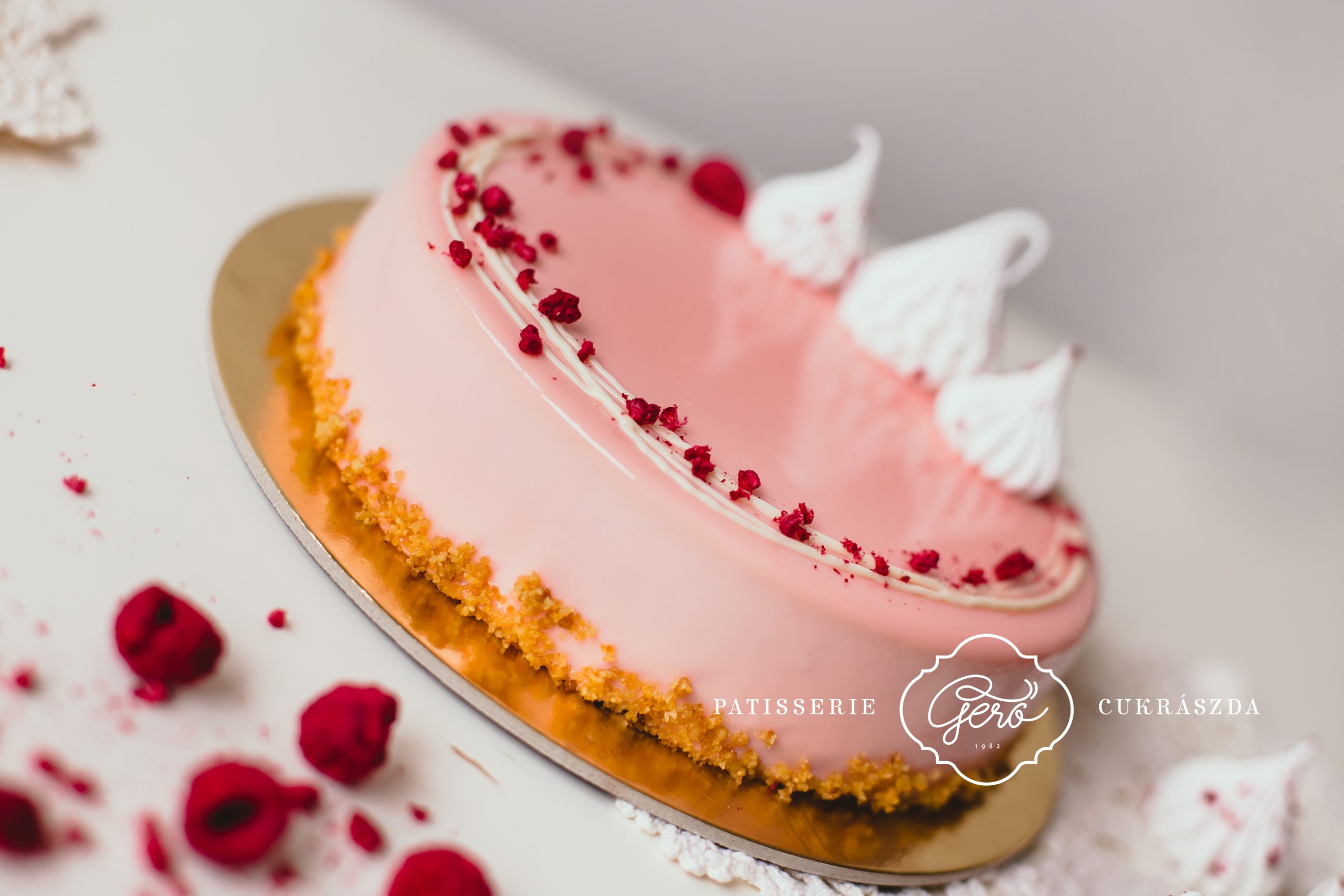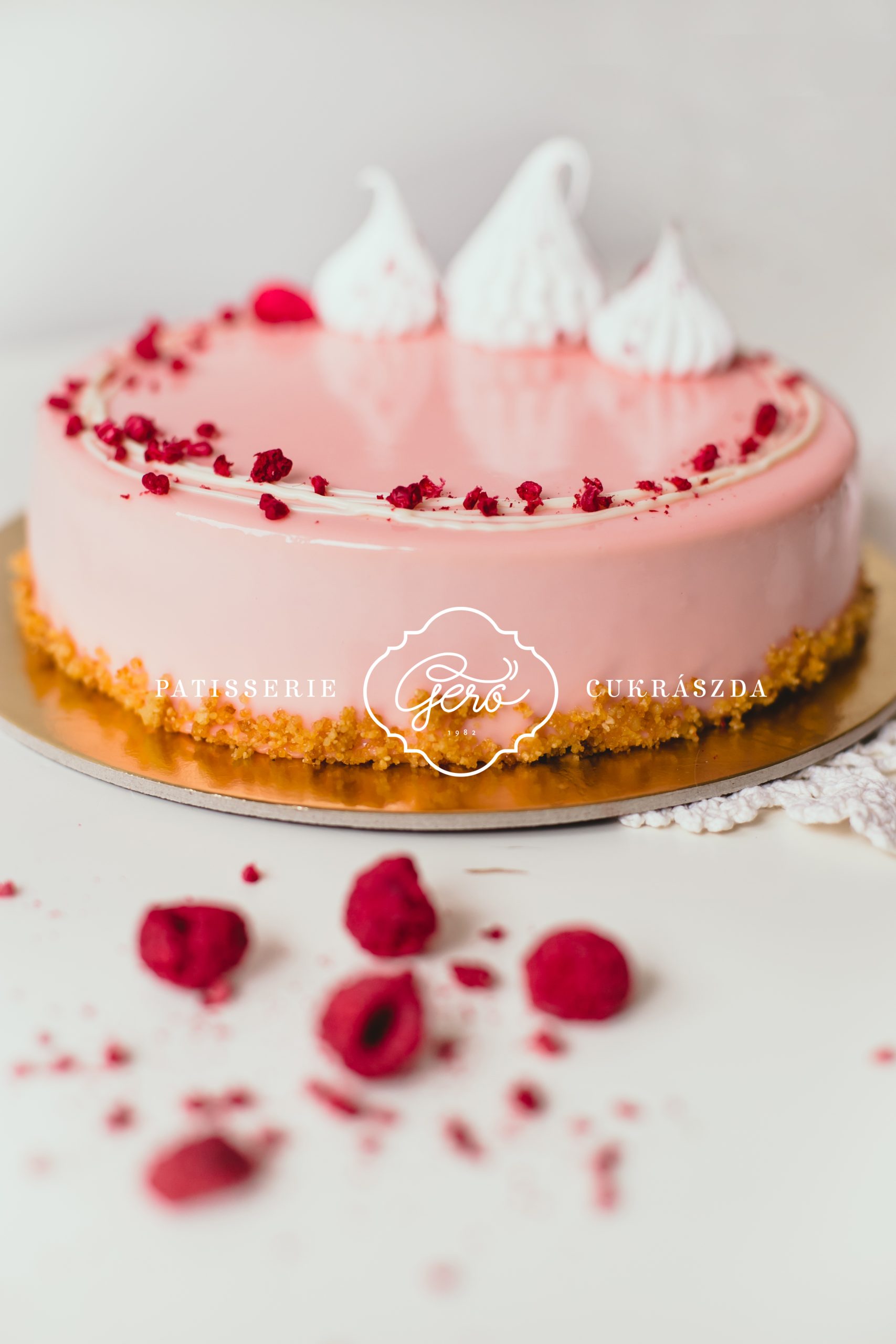 Világos piskótán könnyű, fehércsokoládés málna mousse krém, belsejében 100%-os málnavelő réteggel. Halvány rózsaszín tükörglazúrral borítjuk a tortát, alsó részét saját készítésű mogyoró ropogóssal panírozzuk.