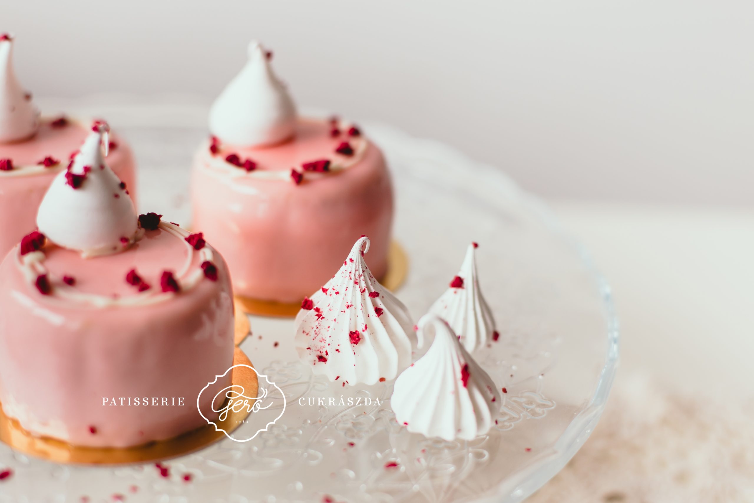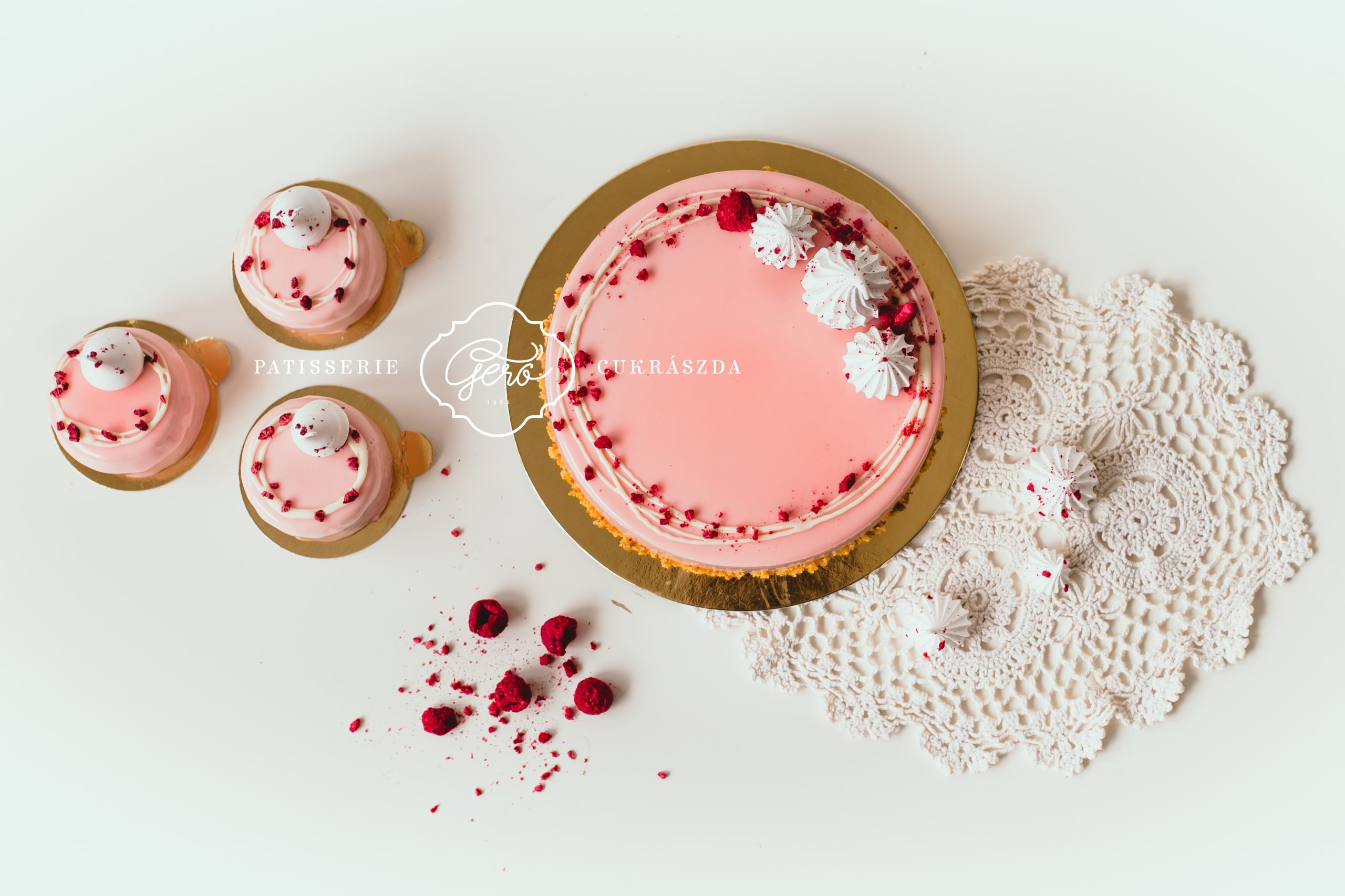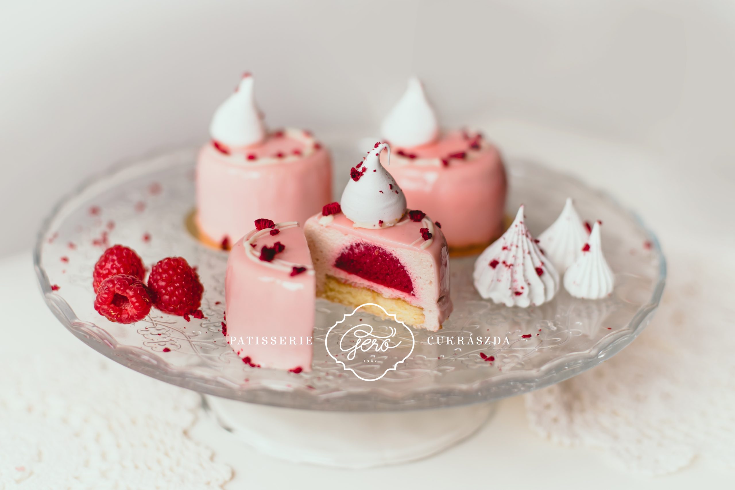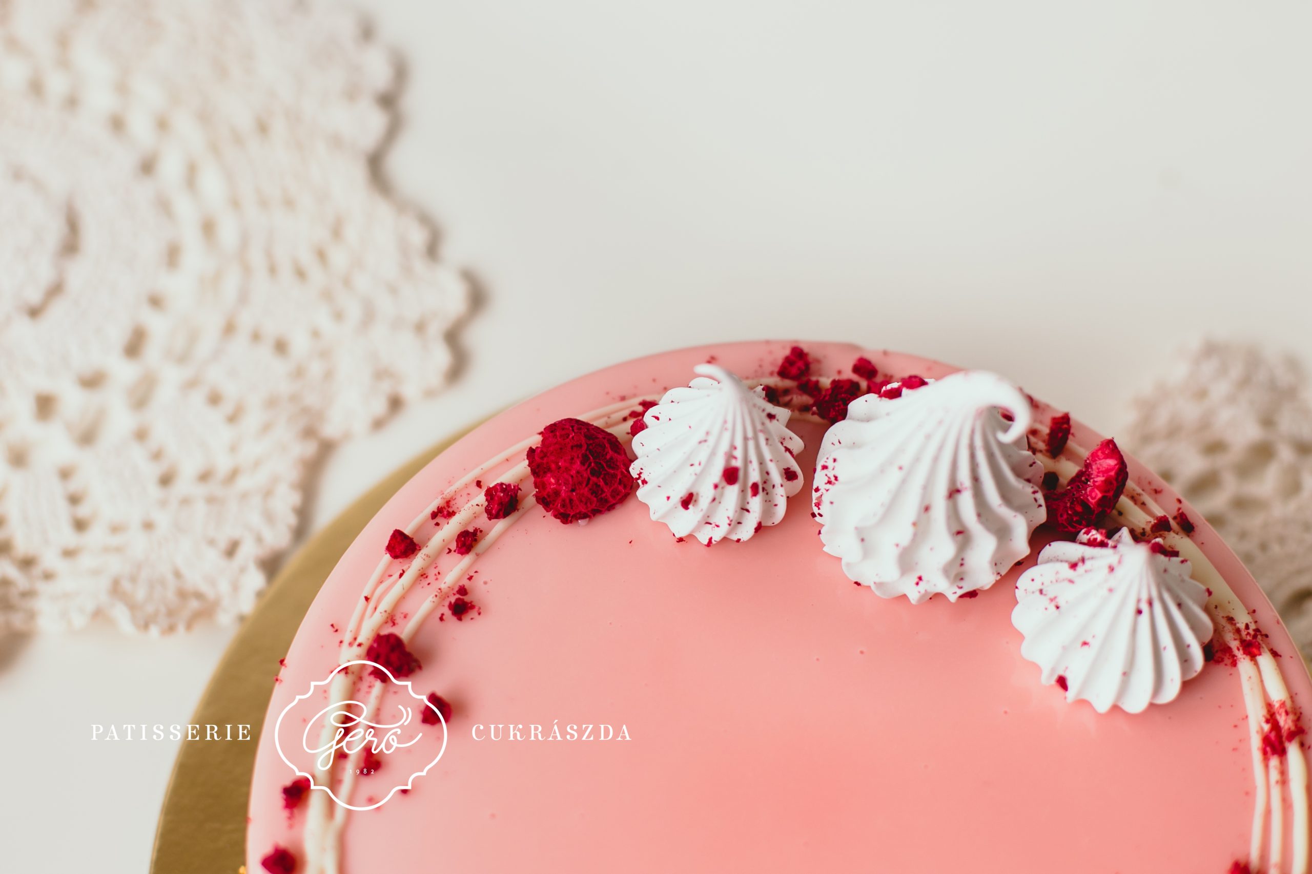 Világos piskótán könnyű, fehércsokoládés málna mousse krém, belsejében 100%-os málnavelő réteggel. Halvány rózsaszín tükörglazúrral borítjuk a tortát, alsó részét saját készítésű mogyoró ropogóssal panírozzuk.